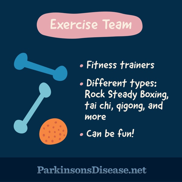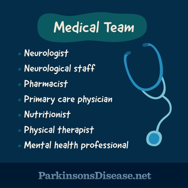 Your neurologist should be #1 on your team. You may also want to check to see if your neurologist completed a fellowship in movement disorders. That means an extra year or two of study in the Parkinson’s field. Experience is important in making this selection as your movement disorder specialist is your go to. As time goes by, your neurologist will explain your options to help manage expectations.